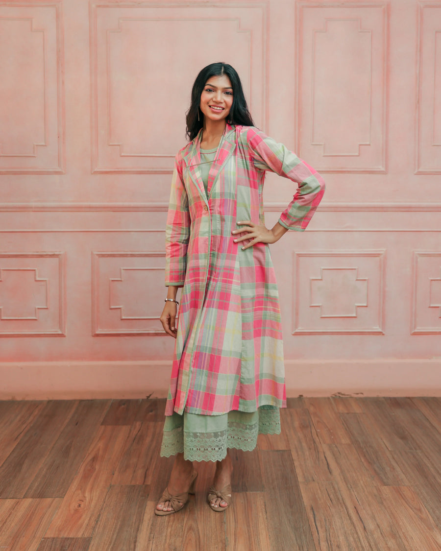 Pink & Mint Green Madras Cotton Checked Jacket & Skirt Set | Classic Details | For Women