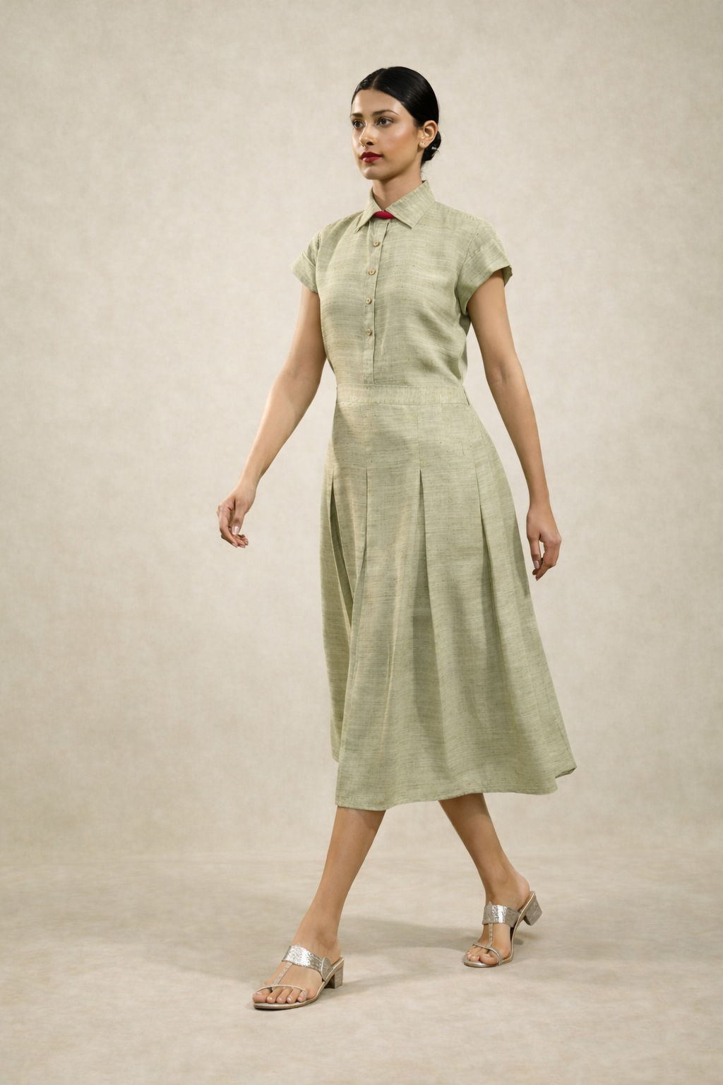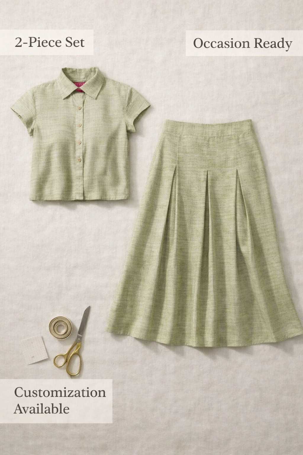 Embrace the serene elegance of nature with our Olive Green Pleated Skirt Set, a poetic blend of structured sophistication and artisanal charm. Meticulously tailored from 100% viscose khadi, this ensemble reconciles the rustic allure of hand-woven textures with a contemporary, fluid drape. The refined shirt, featuring a sharp collar and subtle contrast accents, pairs seamlessly with the midi-length skirt, where architectural box pleats create a sense of graceful movement. Effortlessly chic and endlessly comfortable, it is the ultimate expression of understated luxury for the modern woman’s wardrobe.