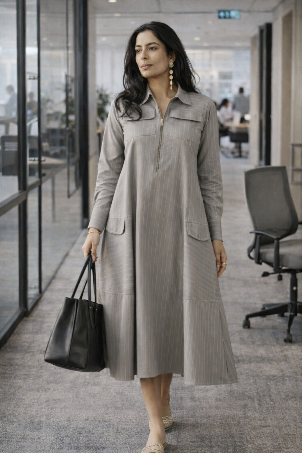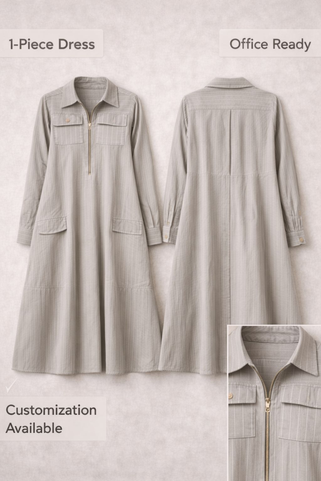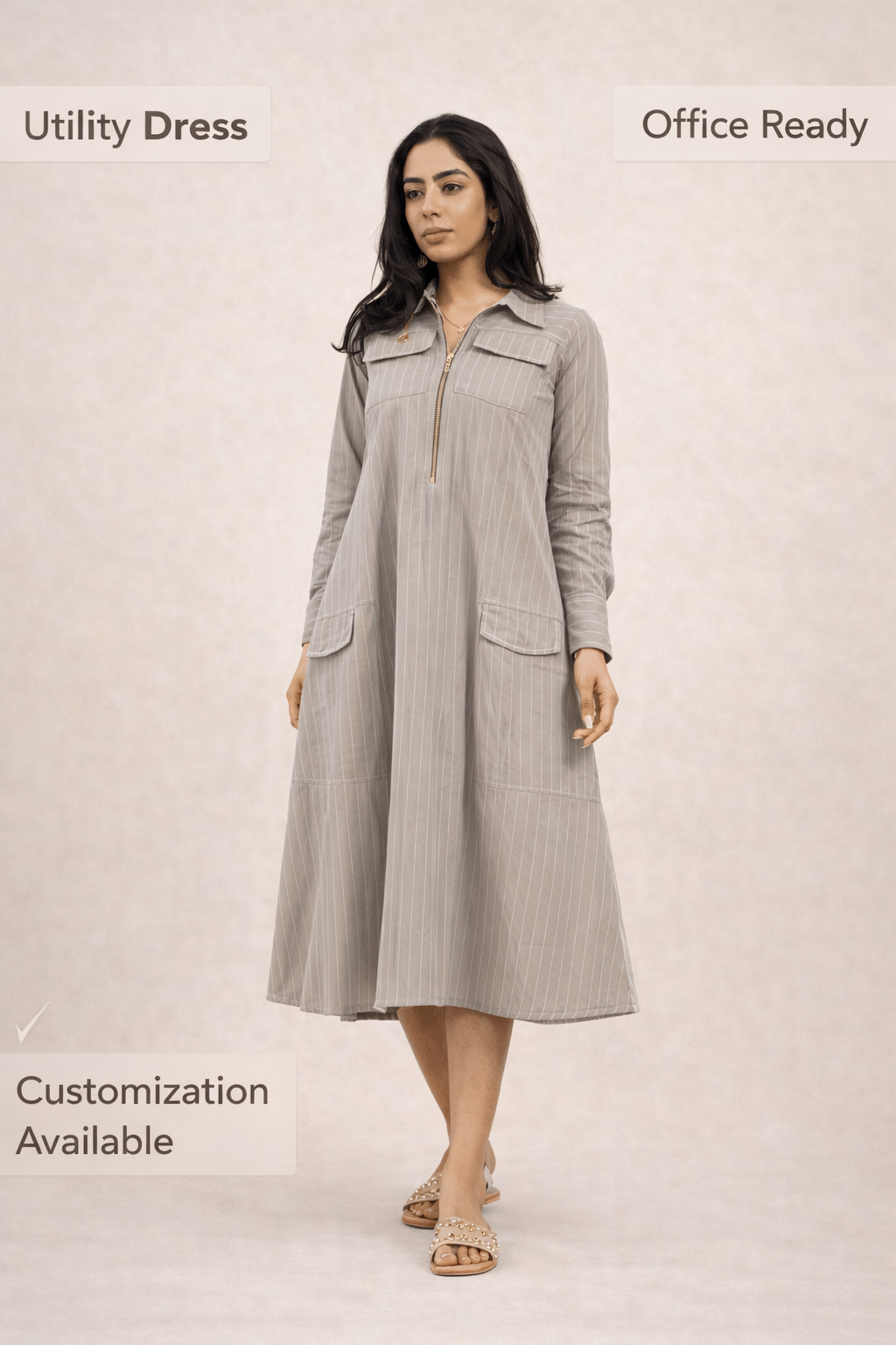 The design is meticulously detailed with a refined shirt collar and a contemporary zip-front closure, accented by functional flap pockets at the chest and oversized patch pockets on the flared skirt. The A-line cut ensures a flattering fit that moves beautifully, making it a versatile choice for everything from city strolls to casual soirees.