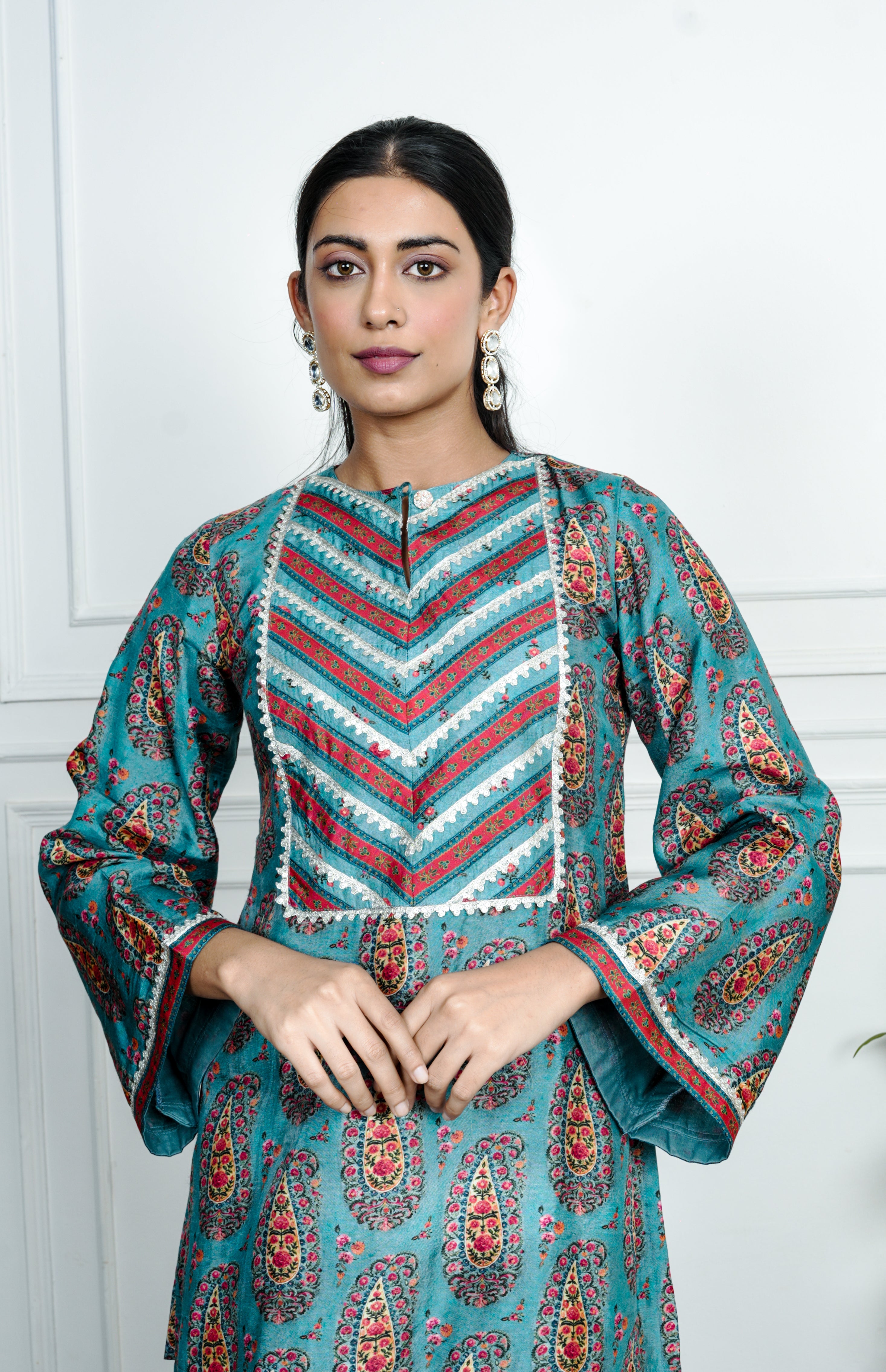 A contemporary take on tradition, this teal-blue suit set is adorned with playful orange prints. The straight-cut kurta is paired with tapered pants and a coordinated dupatta, creating an easygoing yet standout look.