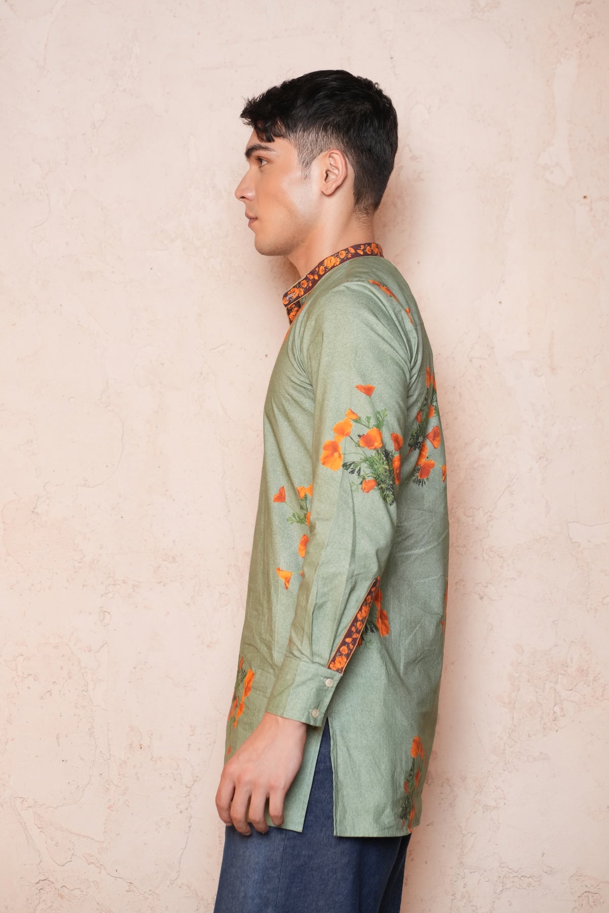 A fresh light green cotton kurta with orange floral threadwork on the placket and sleeves. The bright embroidery makes it stand out without being too loud.