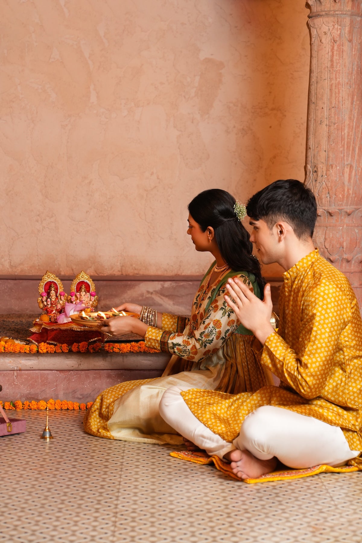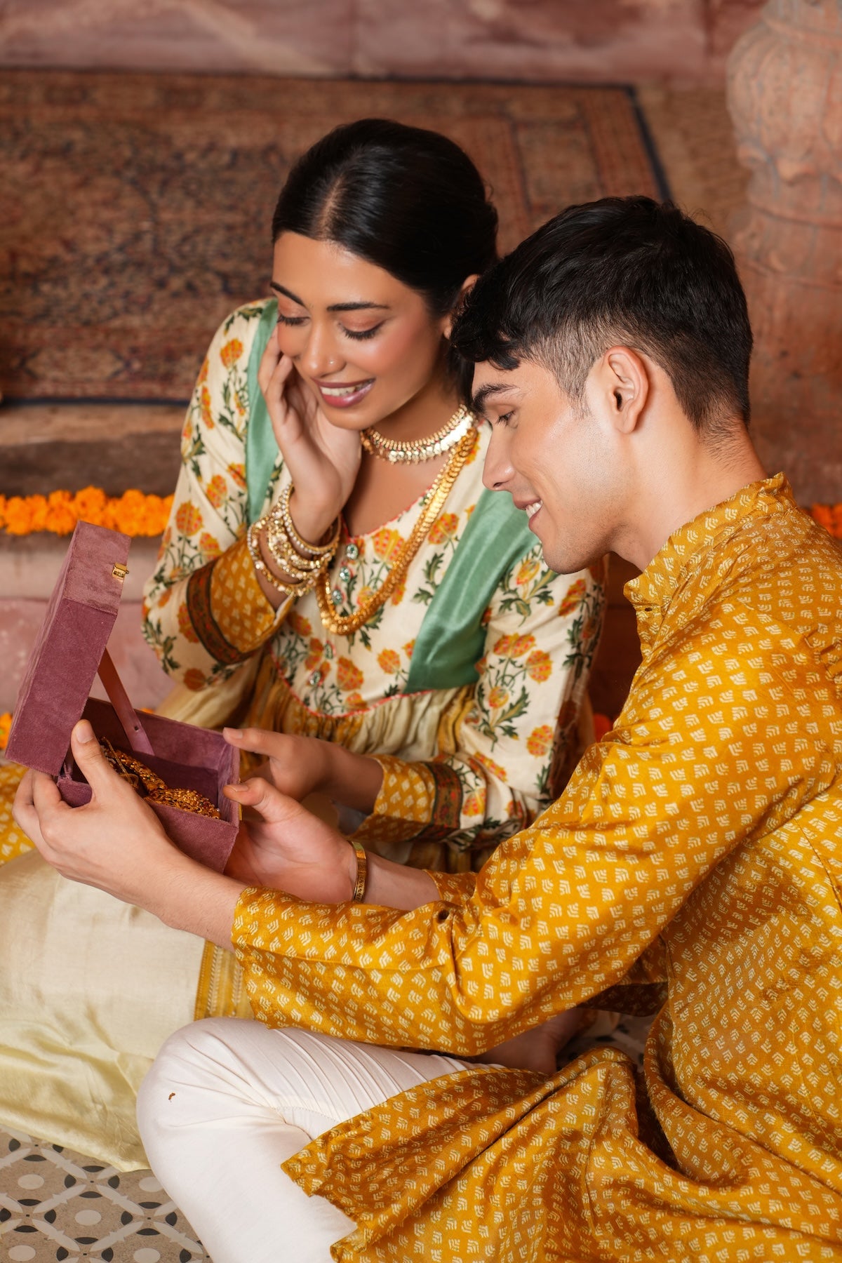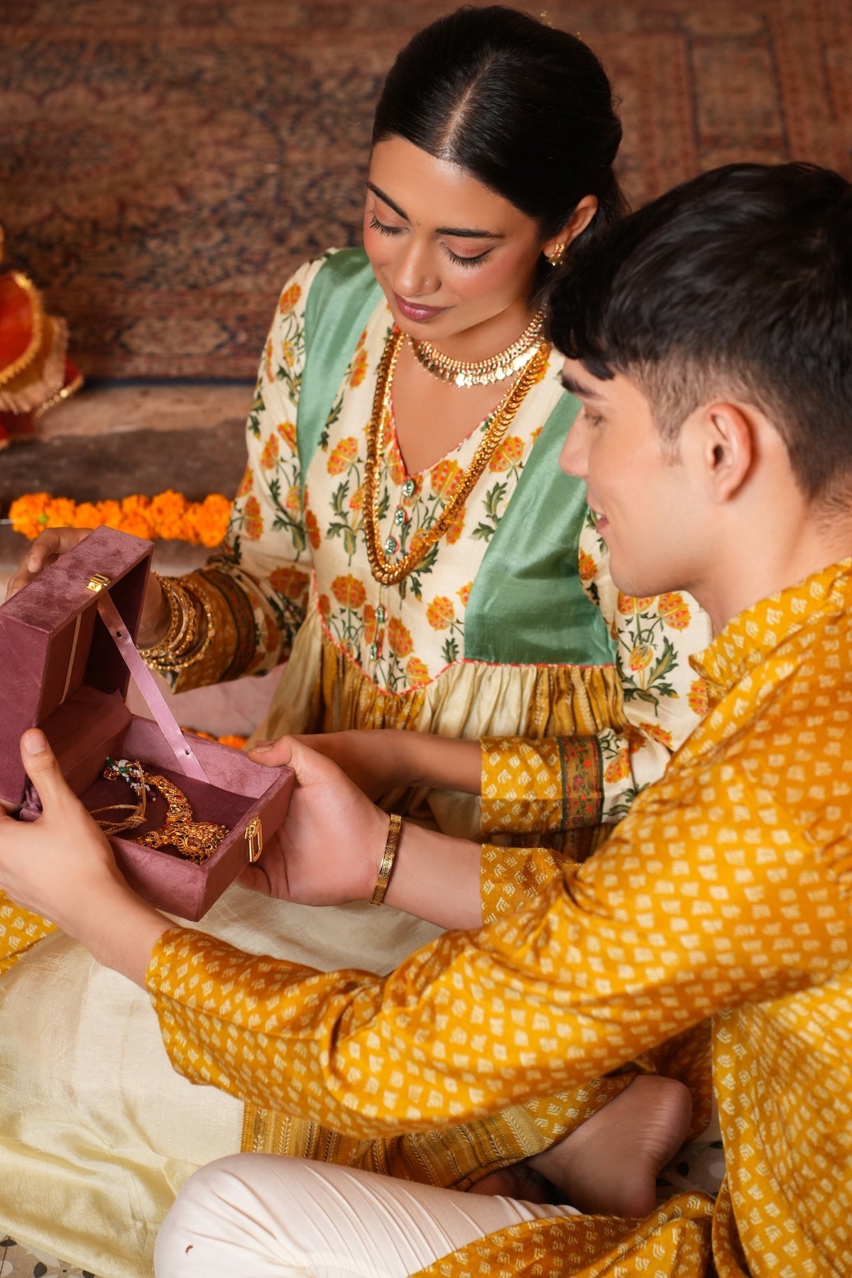 Elevate with oxidized earrings and a pair of tan kolhapuris. Let your hair down in waves or tie a relaxed half-up style. Perfect for festive lunches, laid-back get-togethers, or even styling as a tunic with pants.