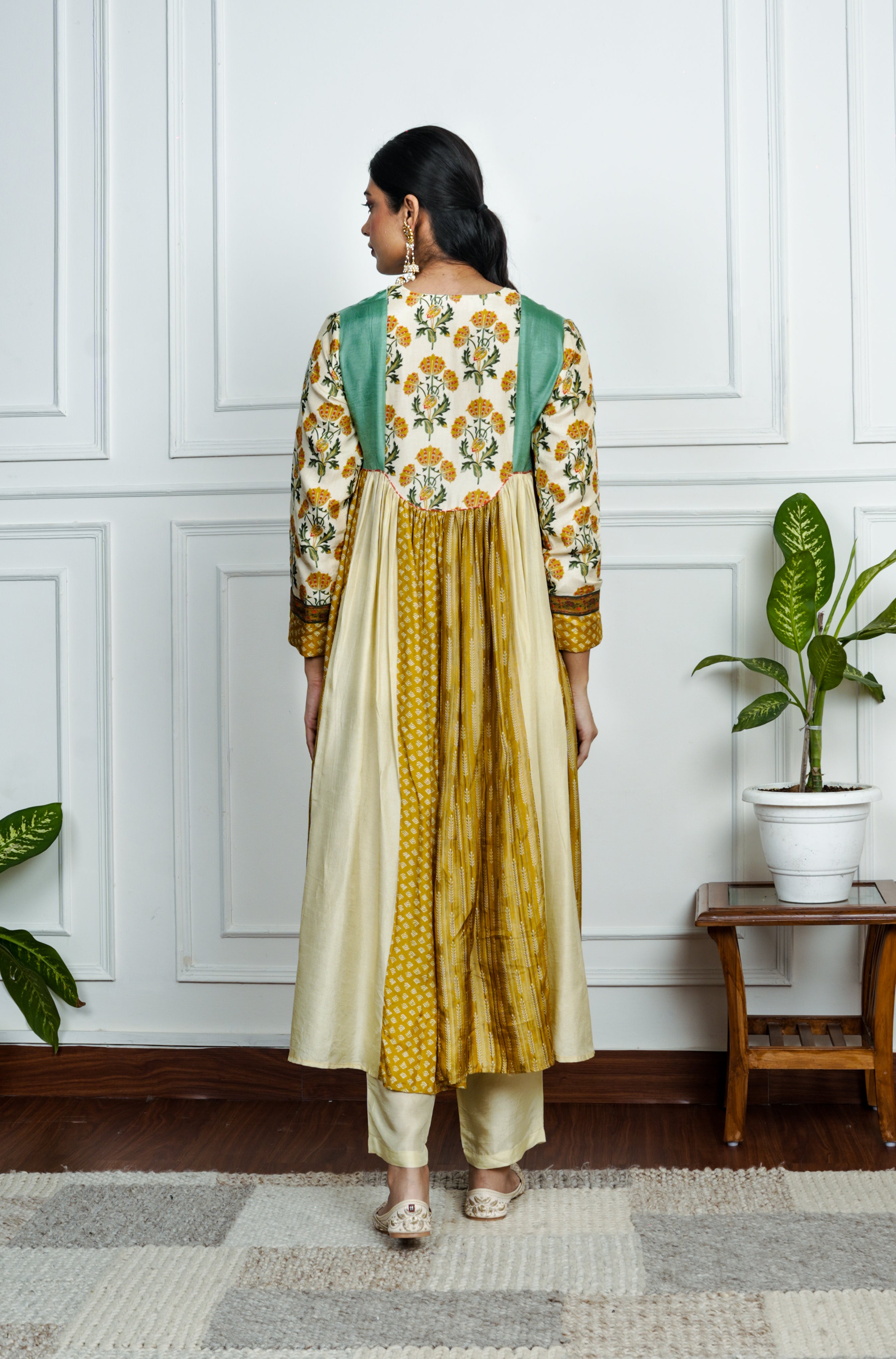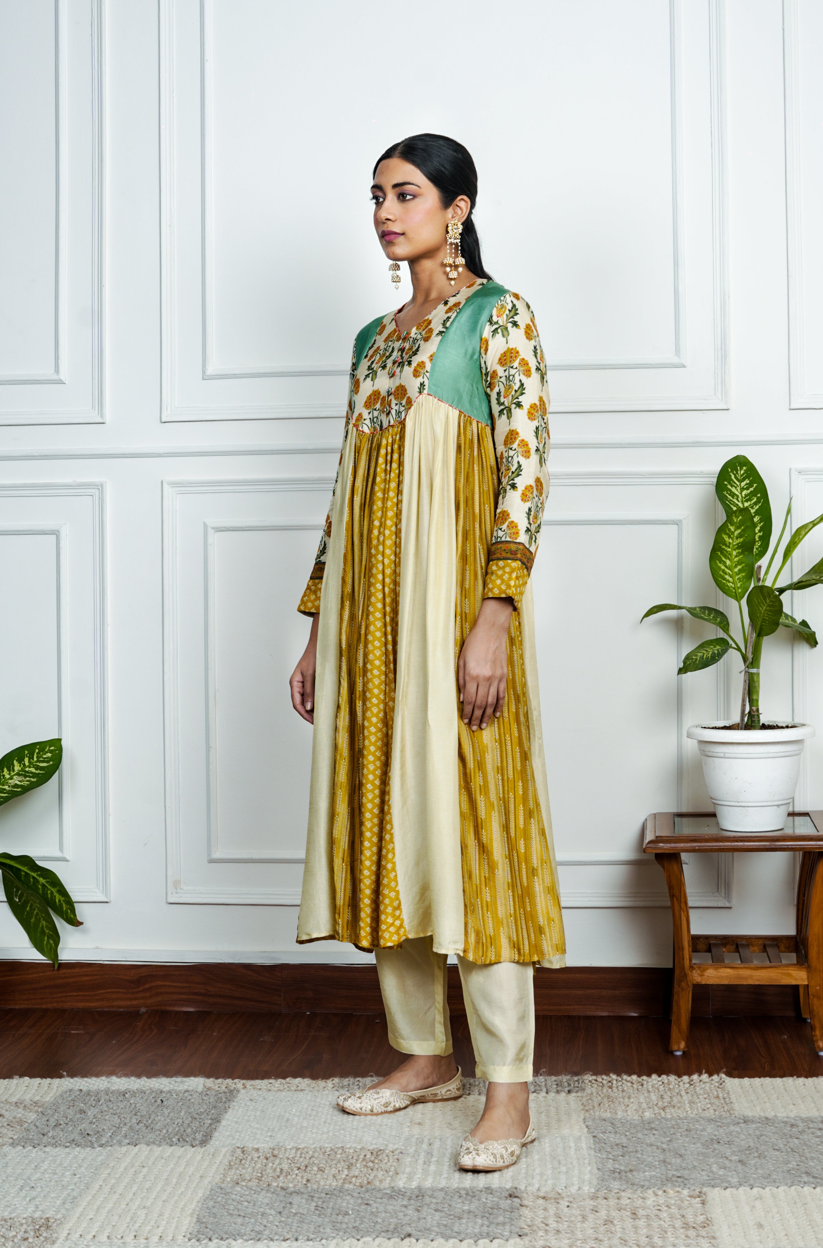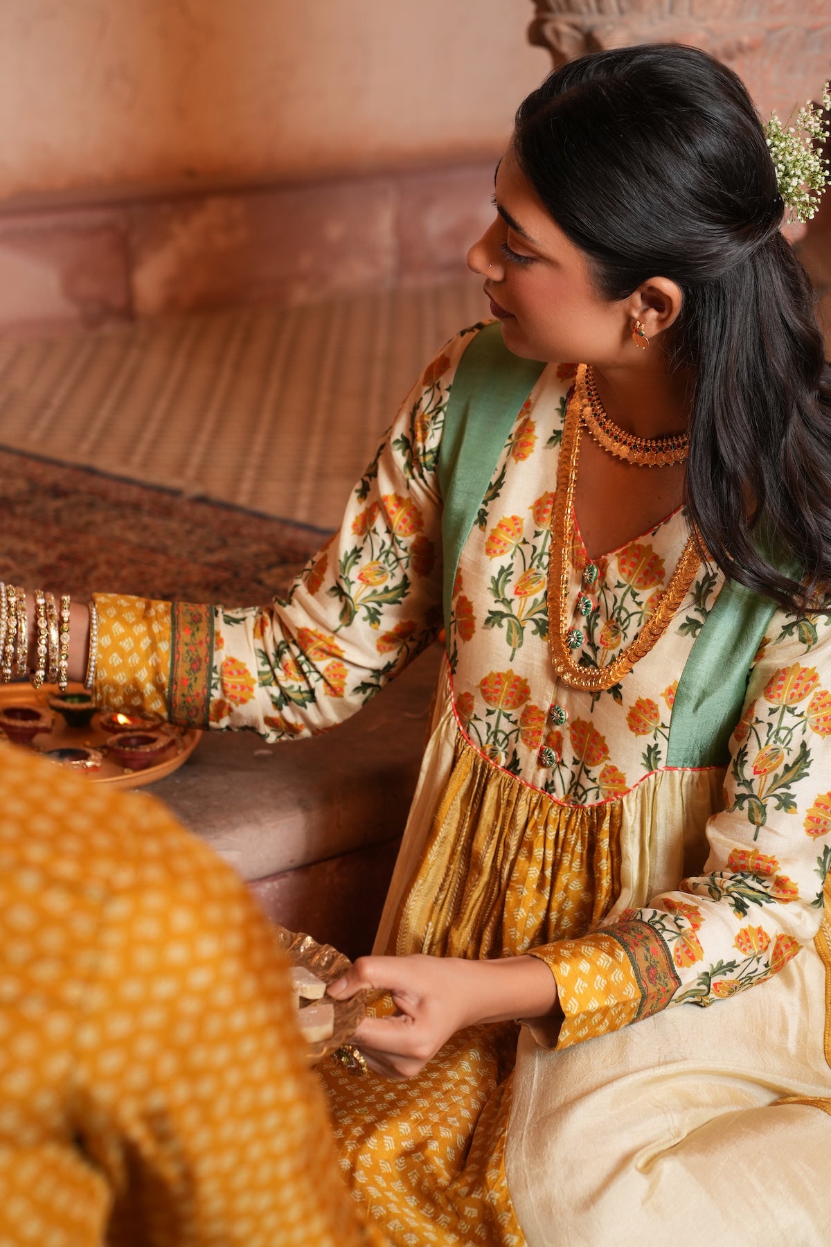 This breezy yellow dress set brings sunshine wherever it goes. With multicolor embroidery, gathered flare, and soft fabric, it’s designed for days when ease and charm go hand-in-hand.