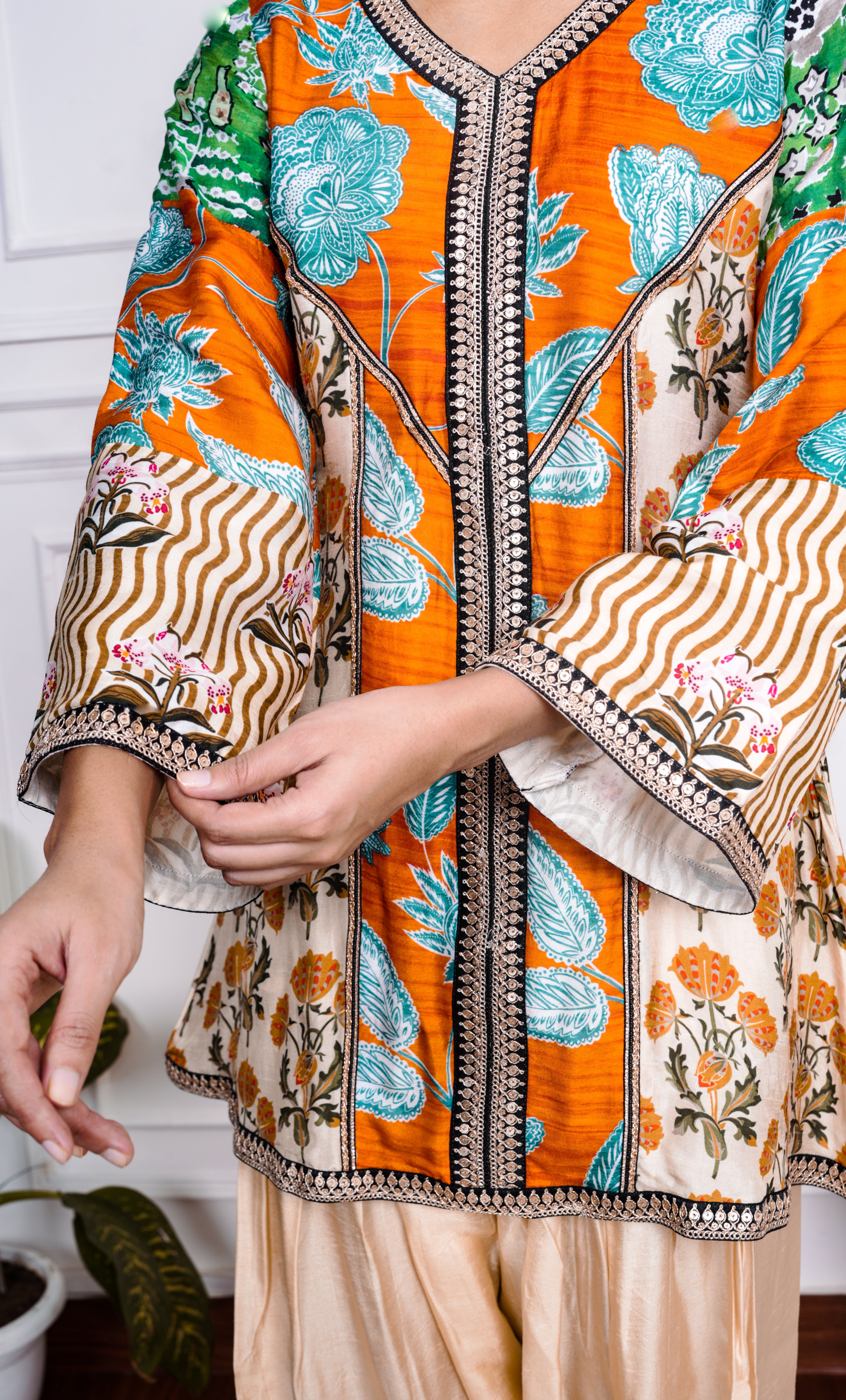 A vibrant 3-piece Farsi salwar suit featuring a printed multicolour kurta, beige Farsi-style salwar, and a coordinating dupatta. The playful print and earthy palette make this set a versatile pick for everyday elegance with a touch of tradition.