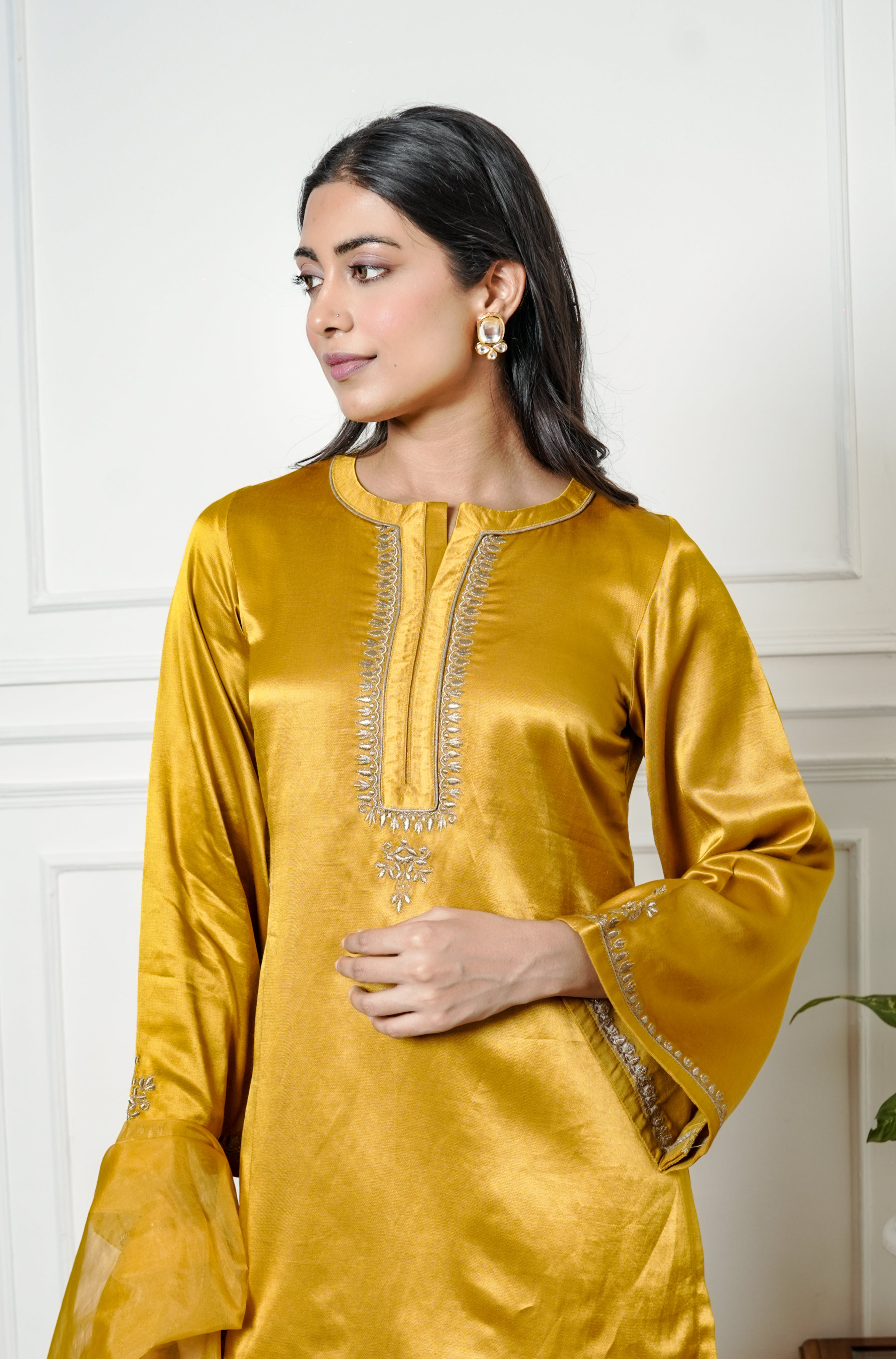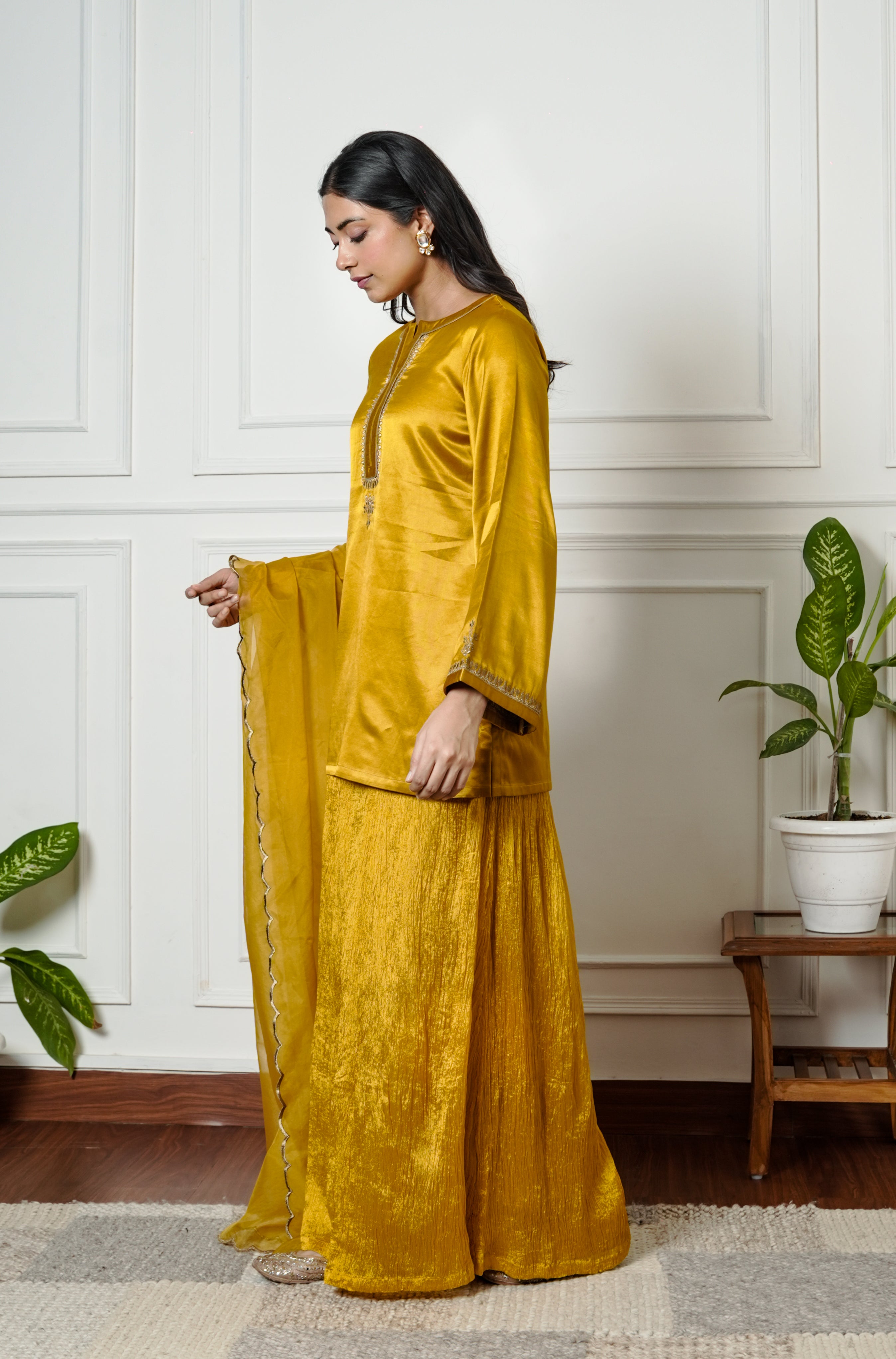 Brighten up your wardrobe with our gorgeous Mustered Yellow Gajji Silk Embroidered Sharara Set with Elasticated Waist Pant and Dupatta.
