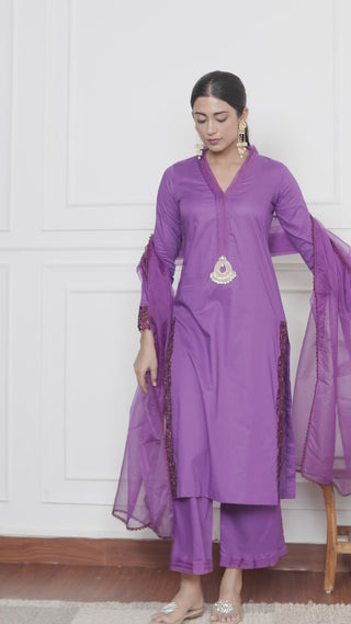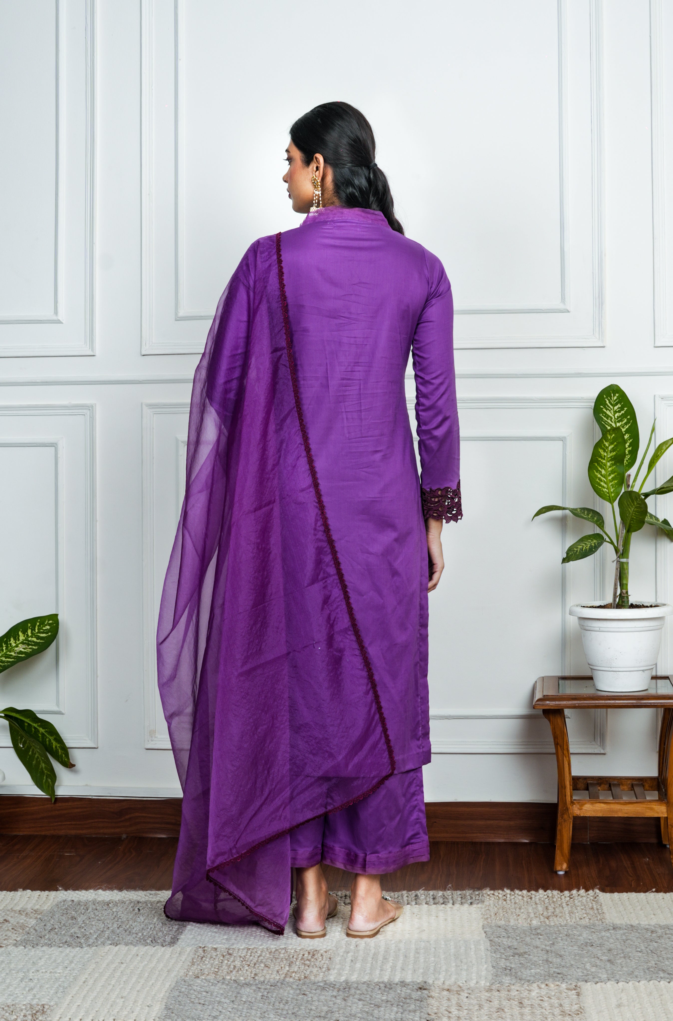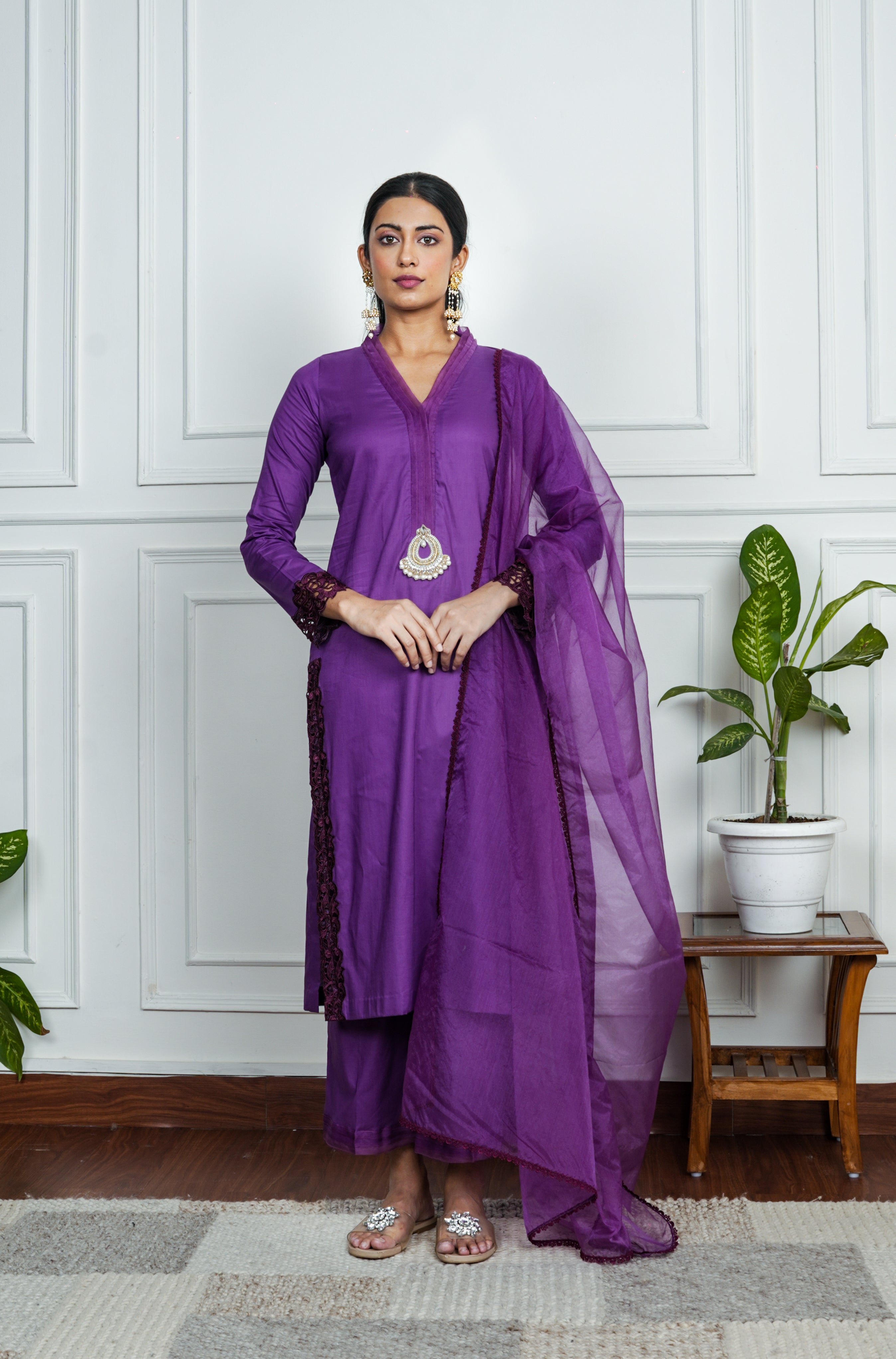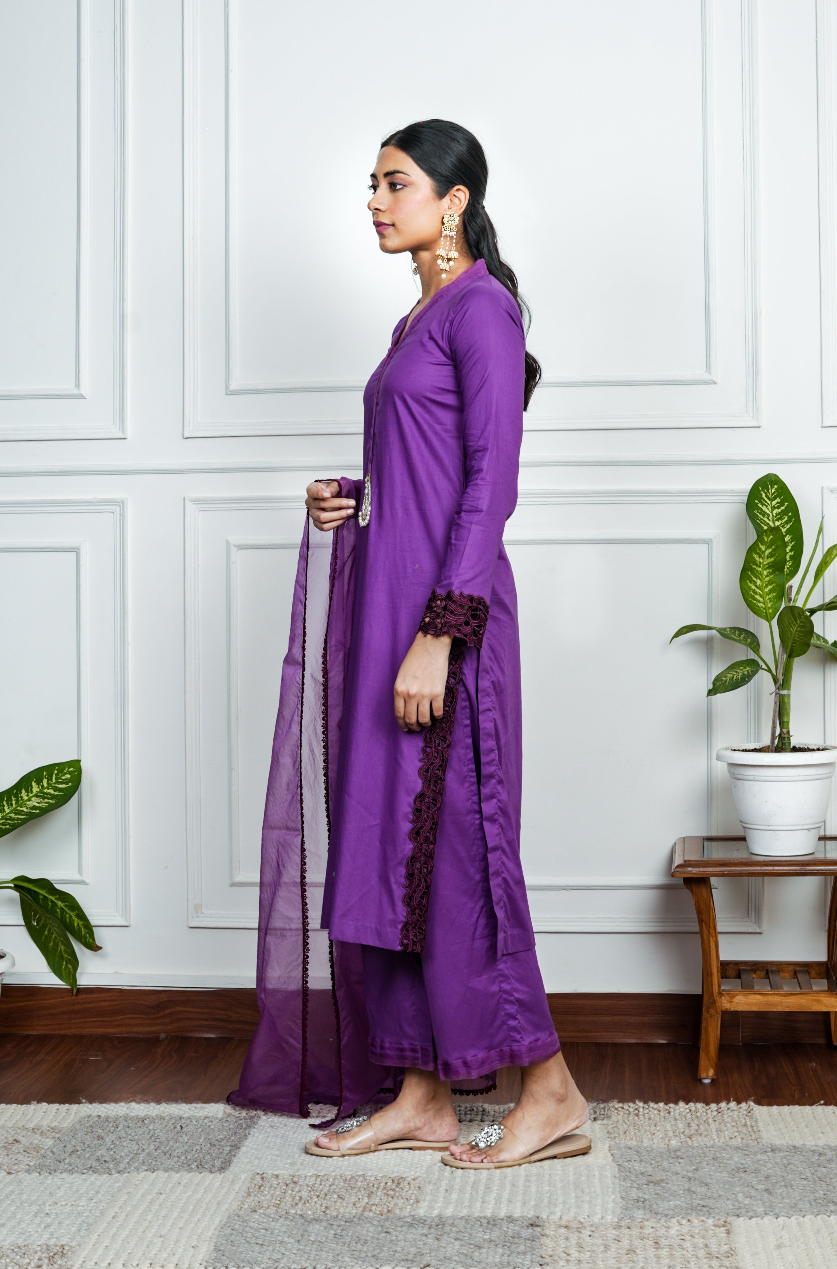 Crafted from soft, breathable lawn fabric, this set includes a tailored kurta, comfy straight pants, and a matching dupatta, all designed for a chic yet comfortable fit. The rich purple color and minimal detailing make it perfect for any occasion.