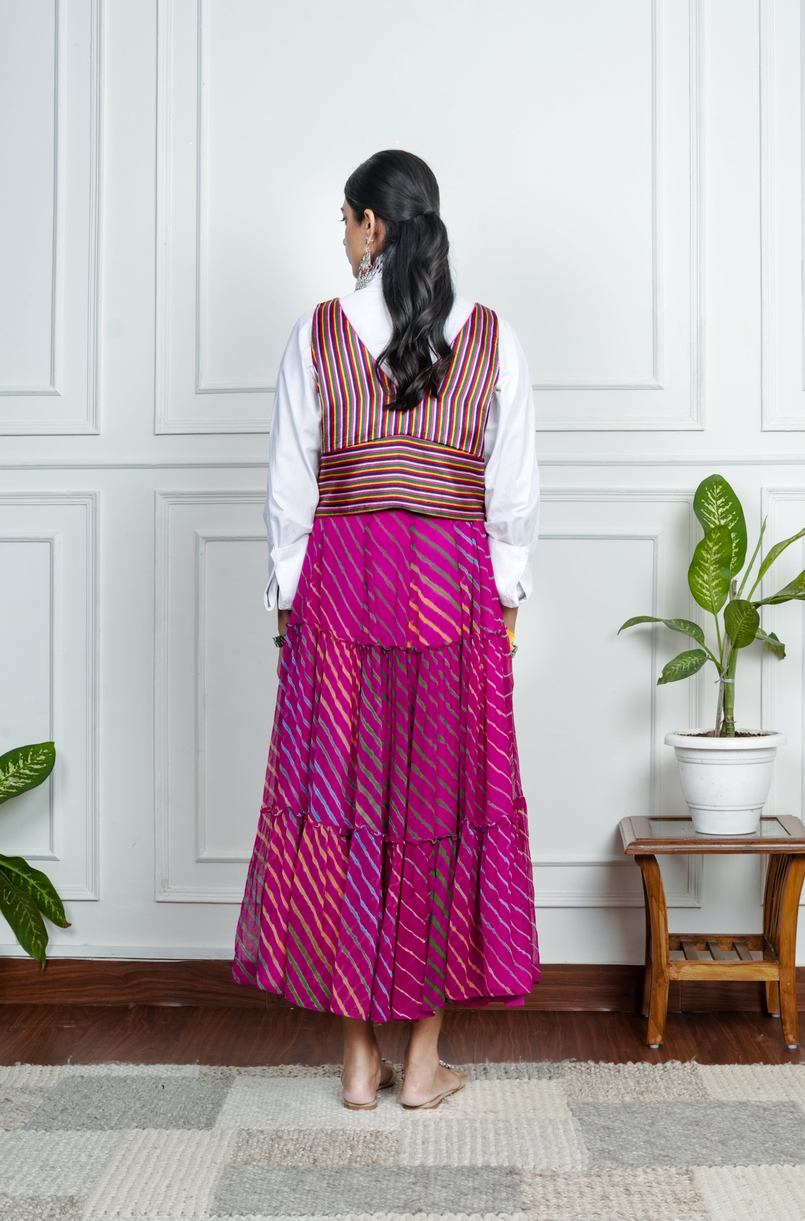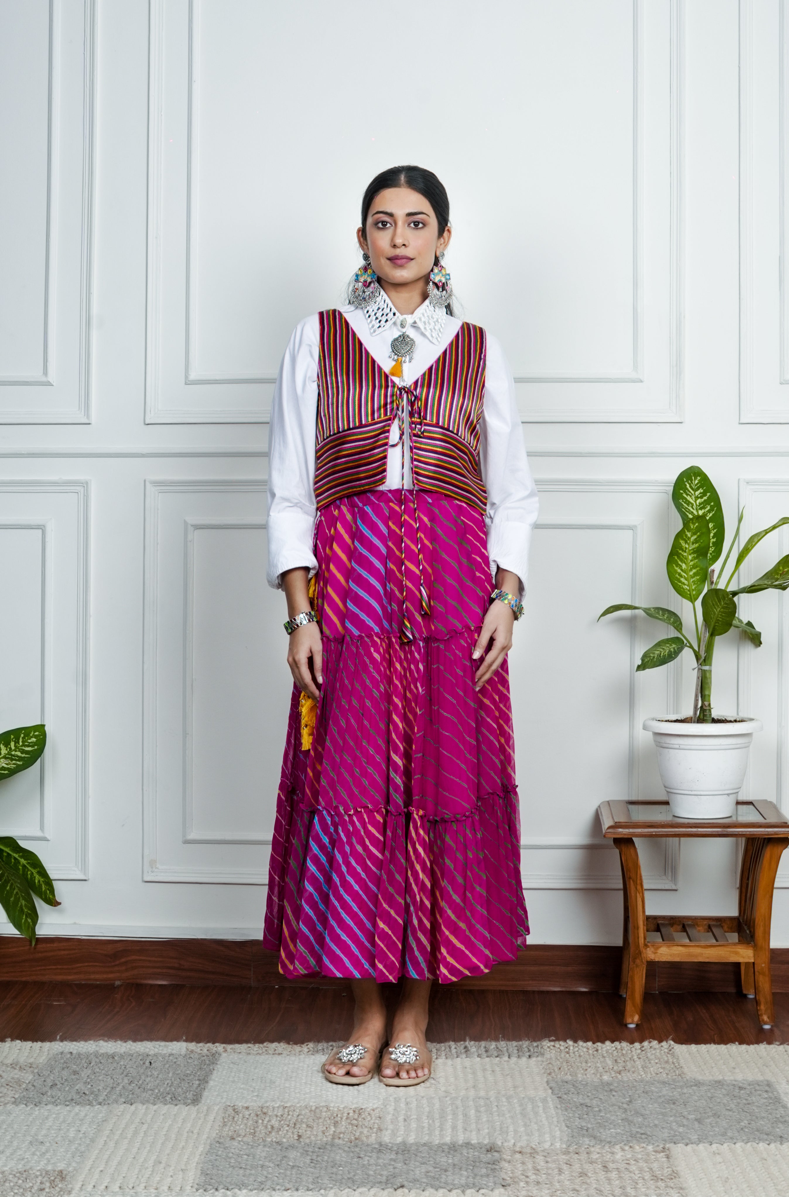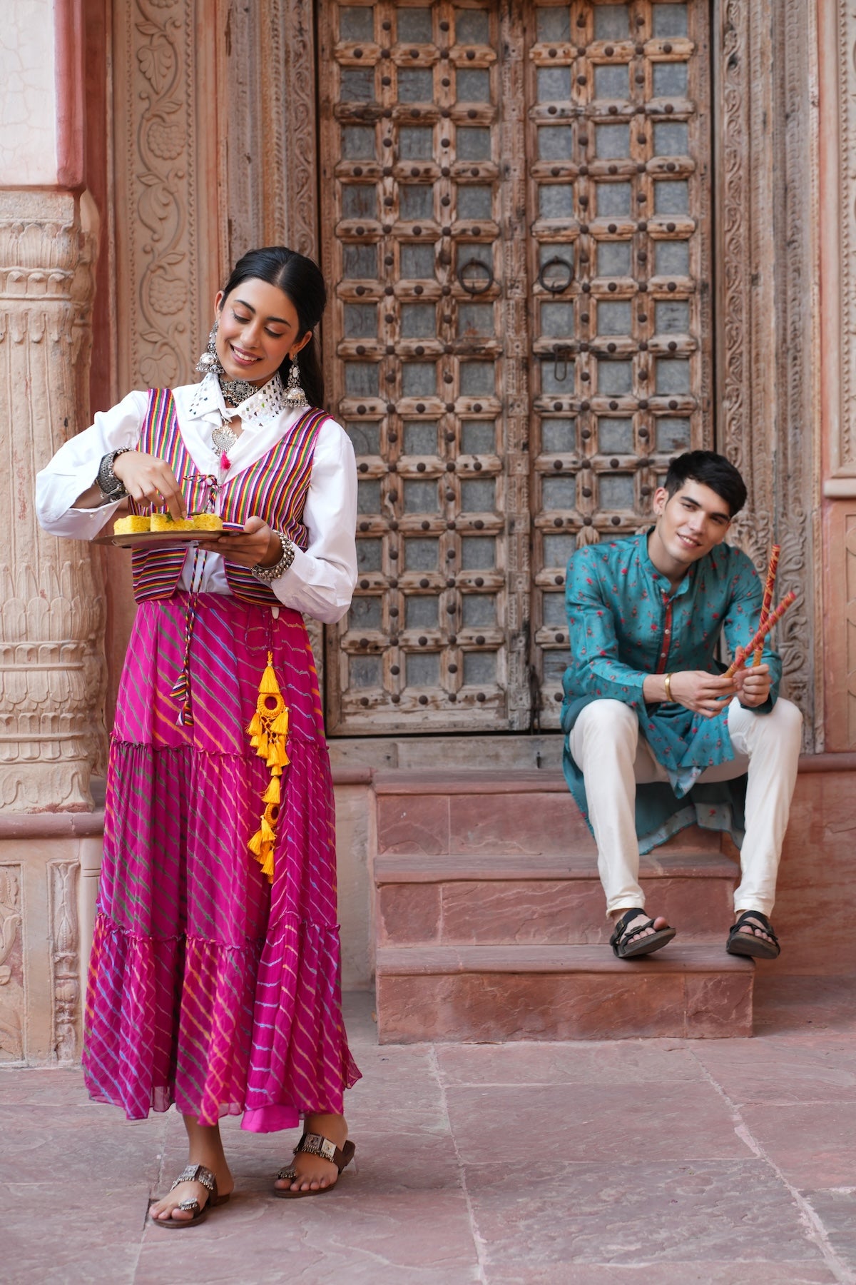 A bold and breezy chiffon skirt in striking rani pink, finished with playful yellow tassels that sway with every step. Lightweight and full of movement, it’s your go-to piece for festive dressing with a fun twist.