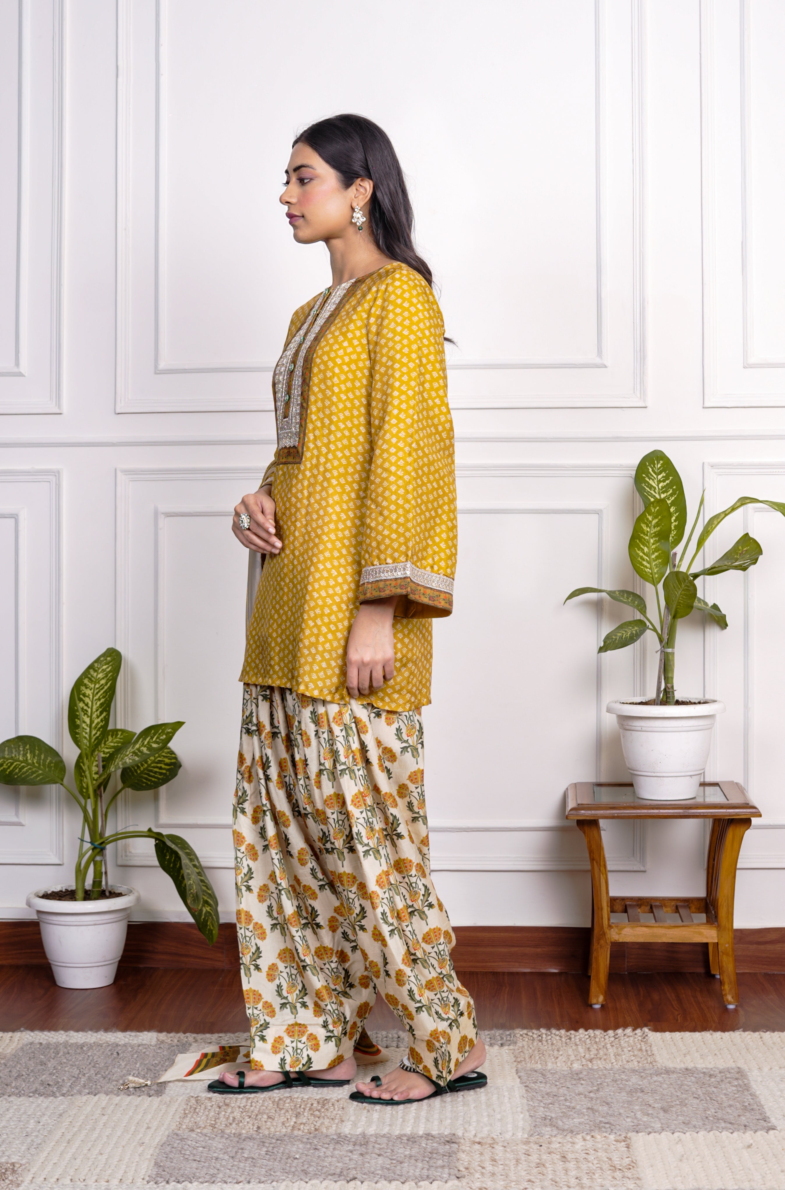 This mustard yellow 3-piece Farsi salwar set is full of festive cheer. The kurta features classic block prints with mirror detailing on the yoke, paired with a printed Farsi-style salwar and a lightweight dupatta to match. It's vibrant, comfortable, and rooted in tradition.